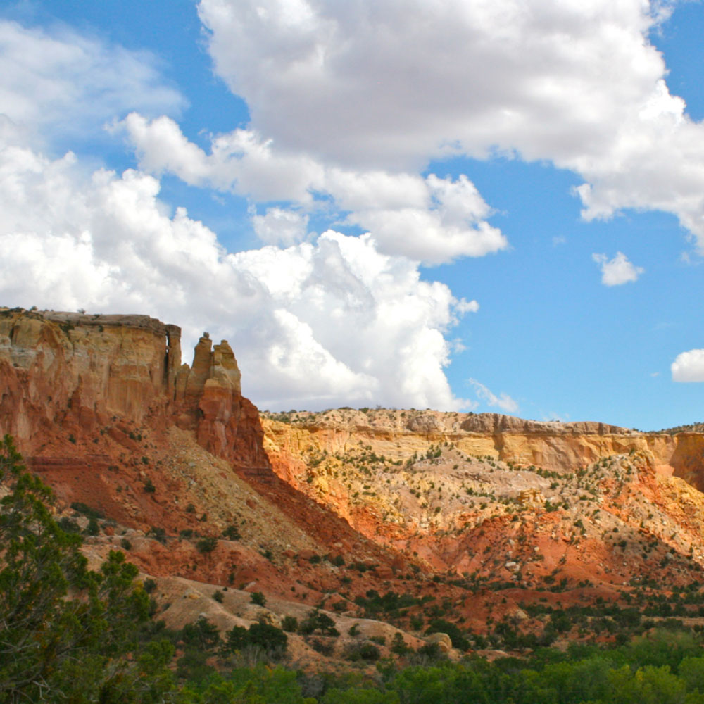 About 60 miles north of Santa Fe, Abiquiu and surrounding communities of El Rito, Gallina, Ojo Caliente and Chama to the north are some of the most beautiful landscapes New Mexico has to offer. Celebrated artist Georgia O’Keeffe lived at nearby Ghost Ranch for many years and also bought a house in Abiquiu in 1945, using it variously as an art subject, residence and studio for several years.